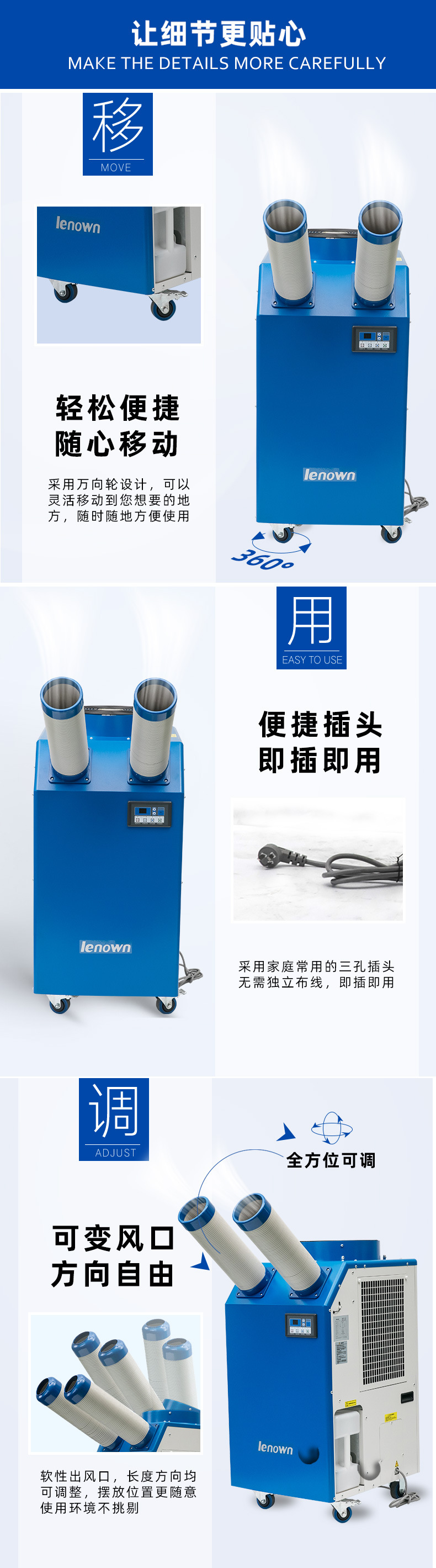 6、兩個(gè)冷風(fēng)口均可270度擺風(fēng),適用于3-5個(gè)崗位的降溫